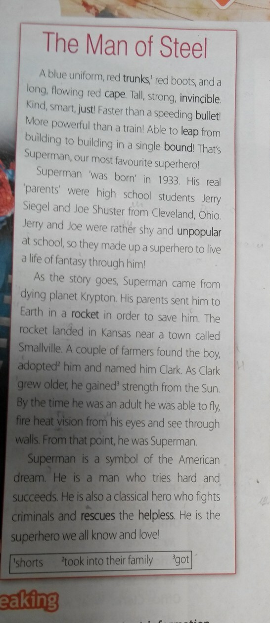 Superhero (главная мысль 1 сущ.) strong, invincible(2прилаг.) superman was born in 1933, superman came from dying planet Krypton, his parents sent him to Earth (3 глагола), superman is a symbol the American dream (фраза из текста), classical hero (заключение)