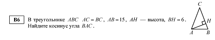 В треугольнике ABC AC=BC, AB=15, AH - высота, BH = 6. Найдите косинус угла BAC