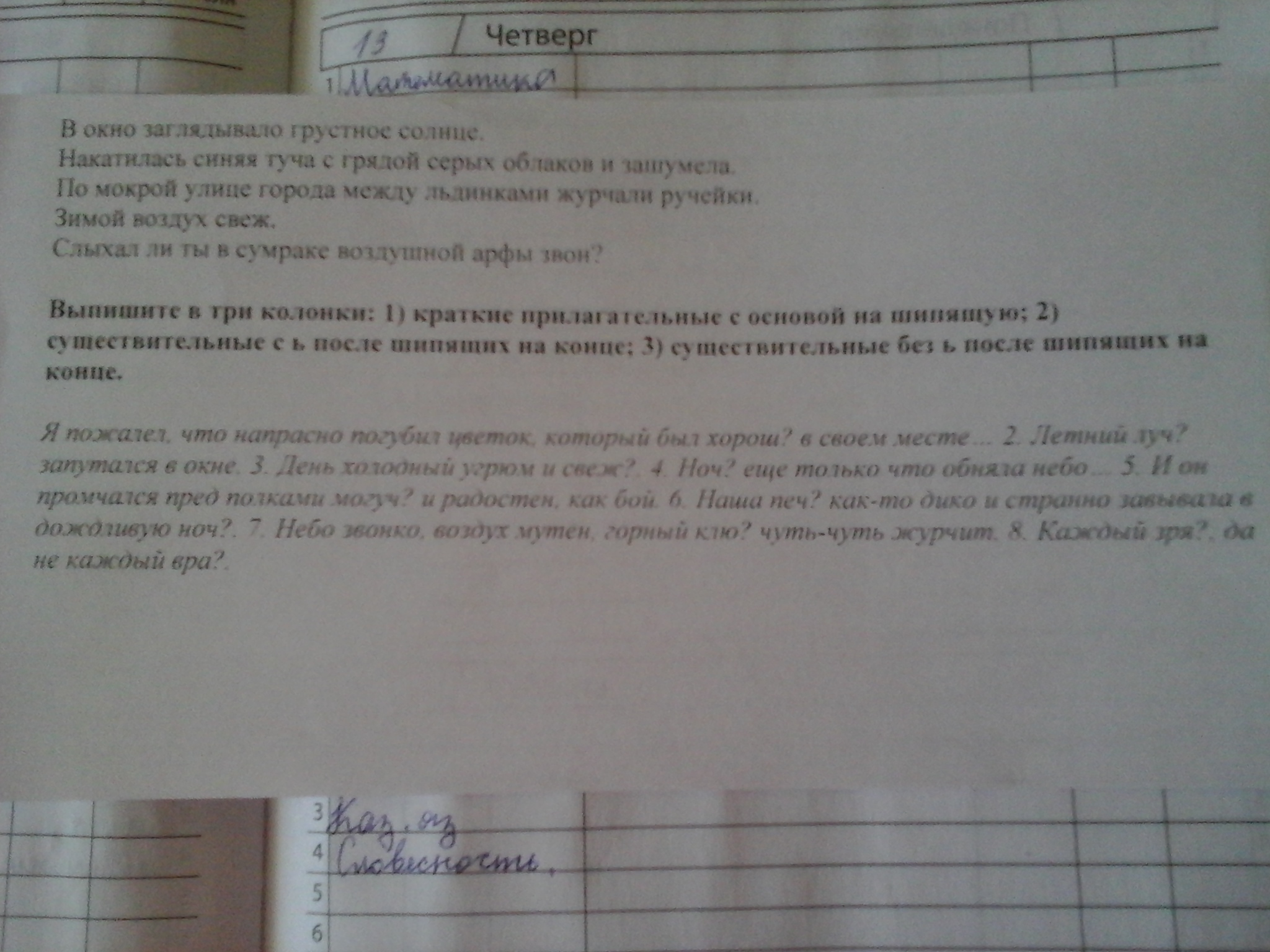 Выпишите в три колонки: 1) араткие прилогательные с основой на шипящую, 2) существительные чс ь после шипящих на конце, 3) существительные без ь после шипящих на коныце.
