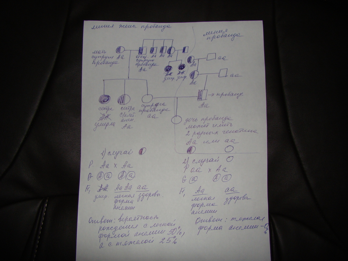 а вторая задача на аутосомно -рецессивный признак. "Пробанд страдает легкой формой серповидноклеточной анемии"., если надо решение вечером постараюсь решить и отправить , если никто не решит. С уважением Ybya.