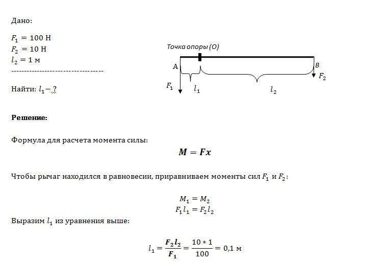 При равновесии рычага на его меньшее плечо действует сила 100Н,а на большее - сила 10Н. Длина большего плеча равна 1 м.Определите длину меньшего плеча.