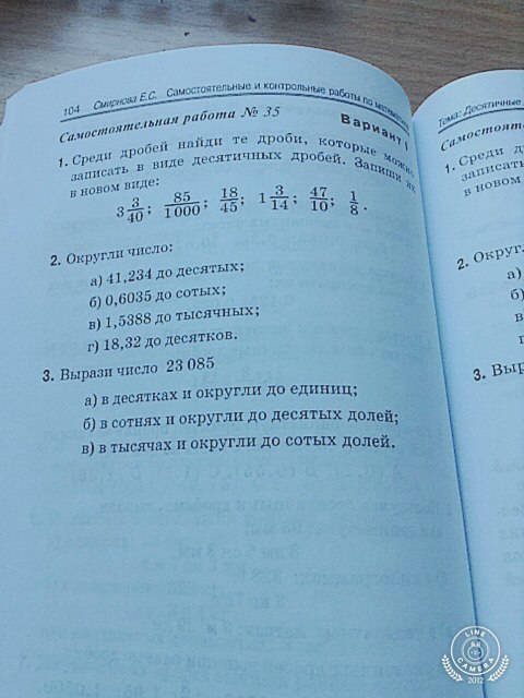 №2 а) 41,2 б) 0,60 в)1,539 г) 18 №3 до десятков: 23080 до сотен: 23100 до тысяч: 23000 до десятков тысяч: 20000 до сотен тысяч: 0 до целых: 23085 до десятых: 23085,0 до сотых: 23085,00 №1 3 целых 3/40 = 3,075; 85/1000= 0,085; 18/45=0,4; 47/10=4,7; 1/8=0,125