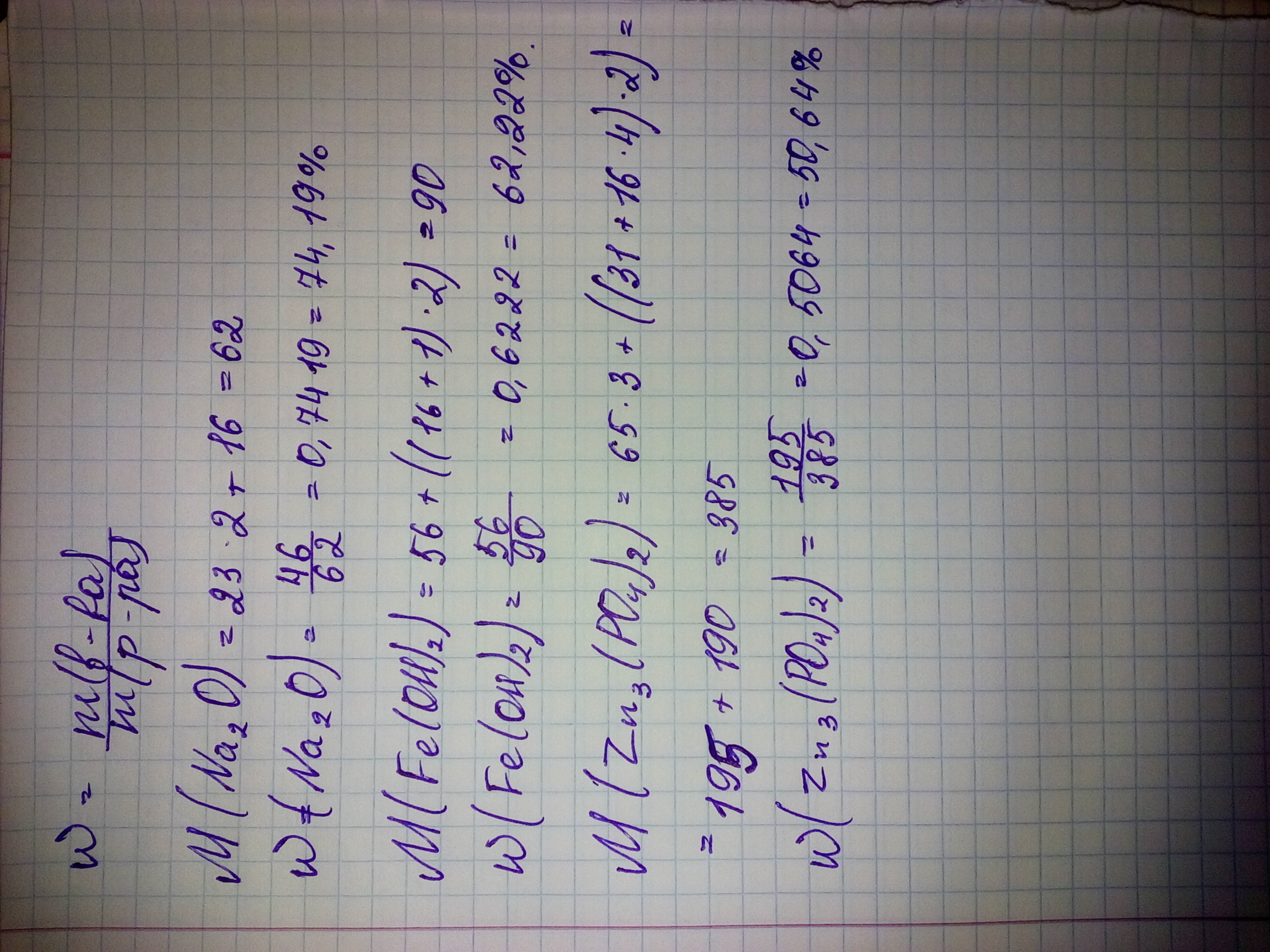 Задача. Вычислите массовую долю (в процентах):химического элемента в веществах : Na2O ,Fe (OH)2 , Zn3 (PO4)2