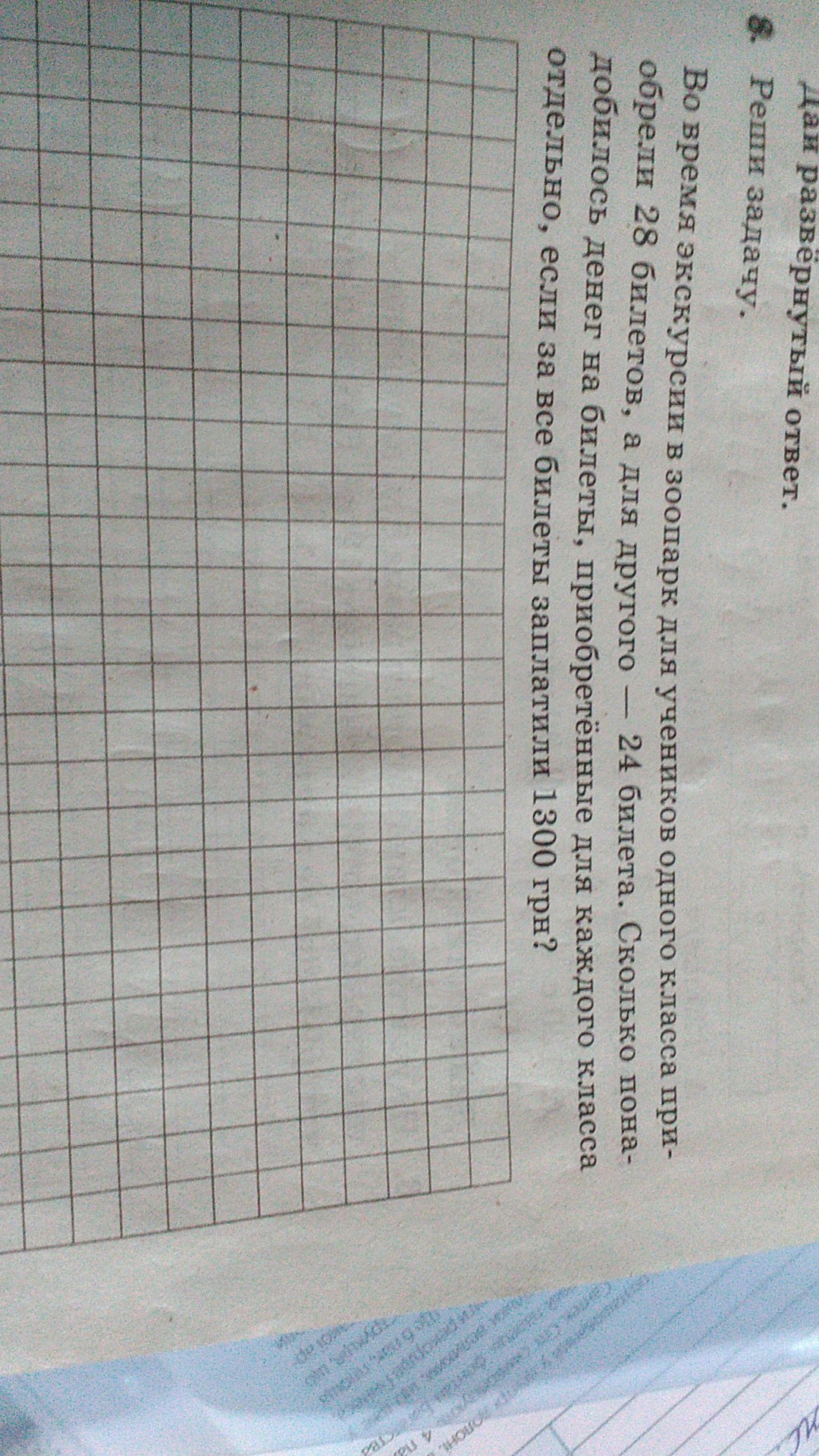 Во время экскурсии в зоопарк для учеников одного класса приобрели 28 билетов,а для другого 24 билета. Сколько понадобилось денег на билеты, приобретённые для каждого класса отдельно, если за все билеты заплатили 1300 грн?