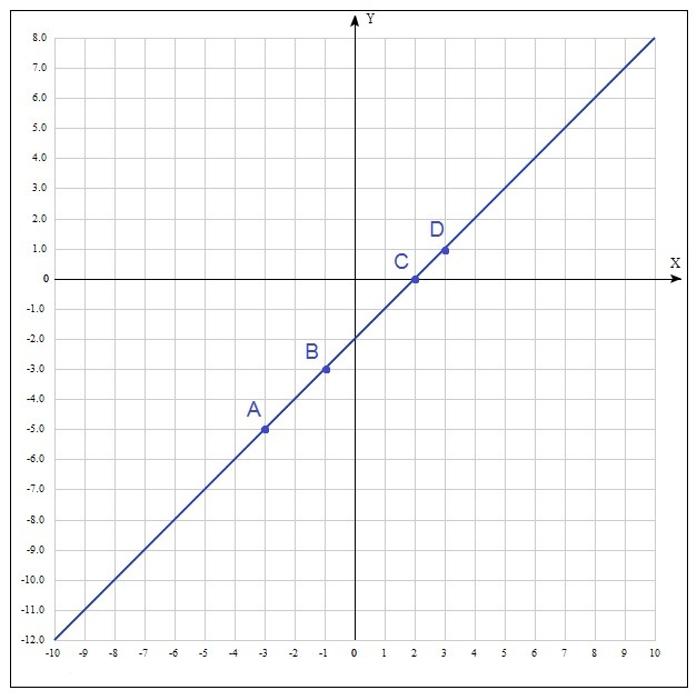 Затем выберем несколько опорных точек для графика: выбираем х и, подставив в формулу функции, найдем соответствующие значения для у: А (-3;-5), B (-1;-3), C (2;0), D (3;1). Соединяем точки и продлеваем.