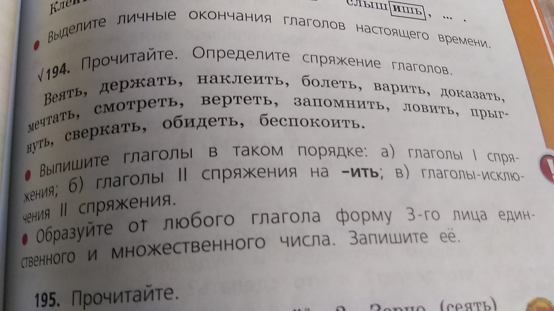 а) Держать, болеть, доказать, мечтать, прыгнуть, сверкать. б) Наклеить, варить, запомнить, ловить, беспокоить. в) Смотреть, вертеть, обидеть.
