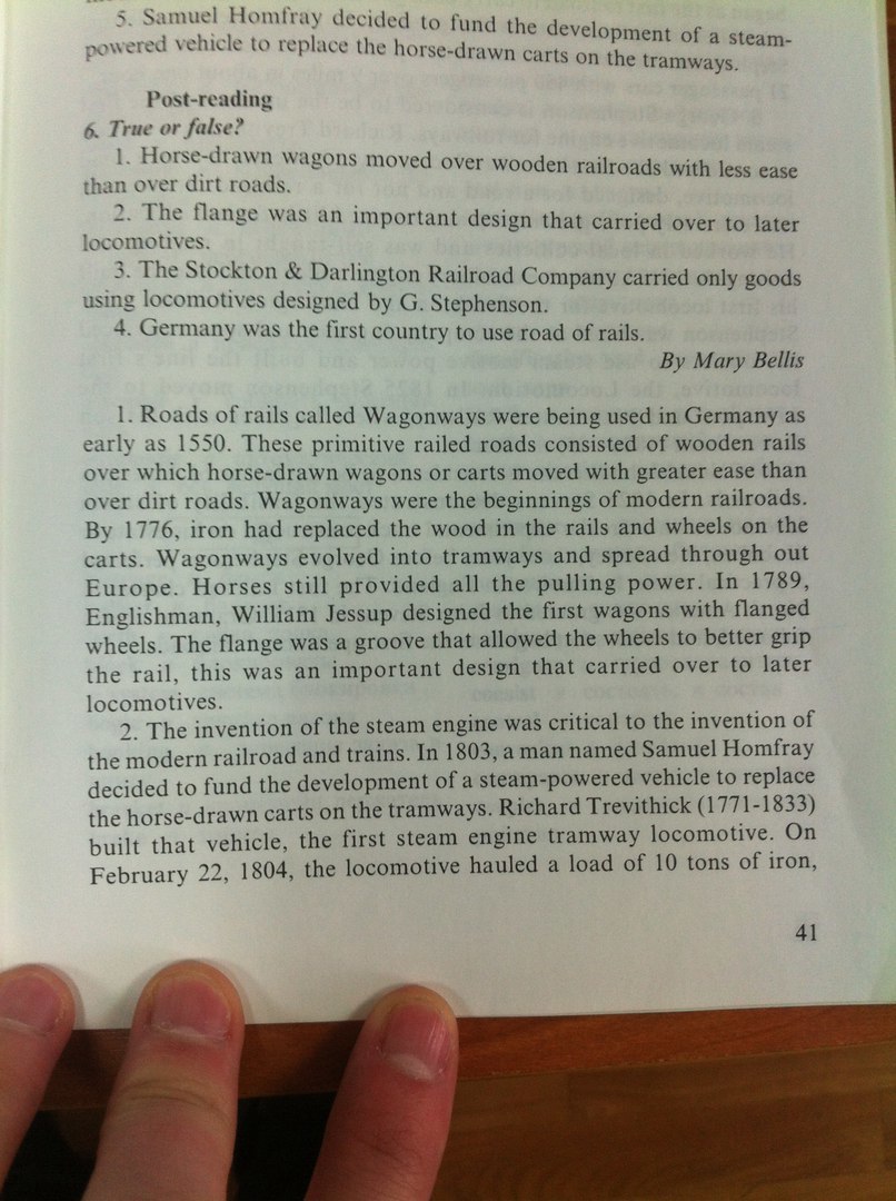 1. Рельсовые дороги называемые "Wagonways" [примерный перевод - пути для вагонов] использовались в Германии аж в 1550 году. Эти примитивные рельсовые дороги состояли из деревянных рельс, передвигаться по которым экипажам и вагонам, запряженным лошадьми было проще чем по грязным дорогам. "Пути для вагонов" были прародителями современных железных дорог. К 1776 году дерево в рельсах и колёсах для вагонов было заменено на железо. "Пути для вагонов" были заменены трамваями, которые распространились по всей Европе. Лошади всё ещё использовались в качестве силы тяги. В 1789 англичанин Вильям Джессап разработал первые вагоны с фланцевыми колёсами. Фланец имел выемки, которые улучшали сцепление колёс с железной дорогой, это было очень важное открытие, которое было применено и к современным локомотивам.