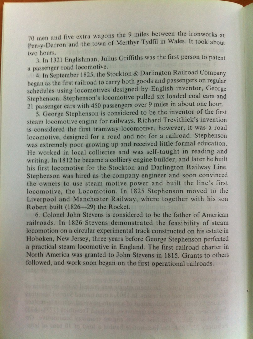 5. Джордж Стефенсон считается изобретателем первого парового двигателя для железнодорожных локомотивов. Изобретение Ричарда Тревитика считается первым трамвайным локомотивом, но тем не менее он был дорожным локомотивом, не предназначенным для железной дороги. Стефенсон рос в большой бедности и получил очень мало образования. Он работал в местных угольных шахтах и сам научился читать и писáть. В 1812 он стал инженером угольных двигателей и позже построил свой первый локомотив для компании "Железнодорожные пути Дарлингтона". Стефенсон был нанят в качестве инженера компании и скоро убедил владельцев использовать паровую тягу и построить первый локомотив, "Locomotion" [имя собственное]. В 1825 Стефенсон перешёл в компанию "Железнодорожные пути Ливерпуля и Манчестера", где вместе со своим сыном Робертом построил "Ракету" [имя собственное].