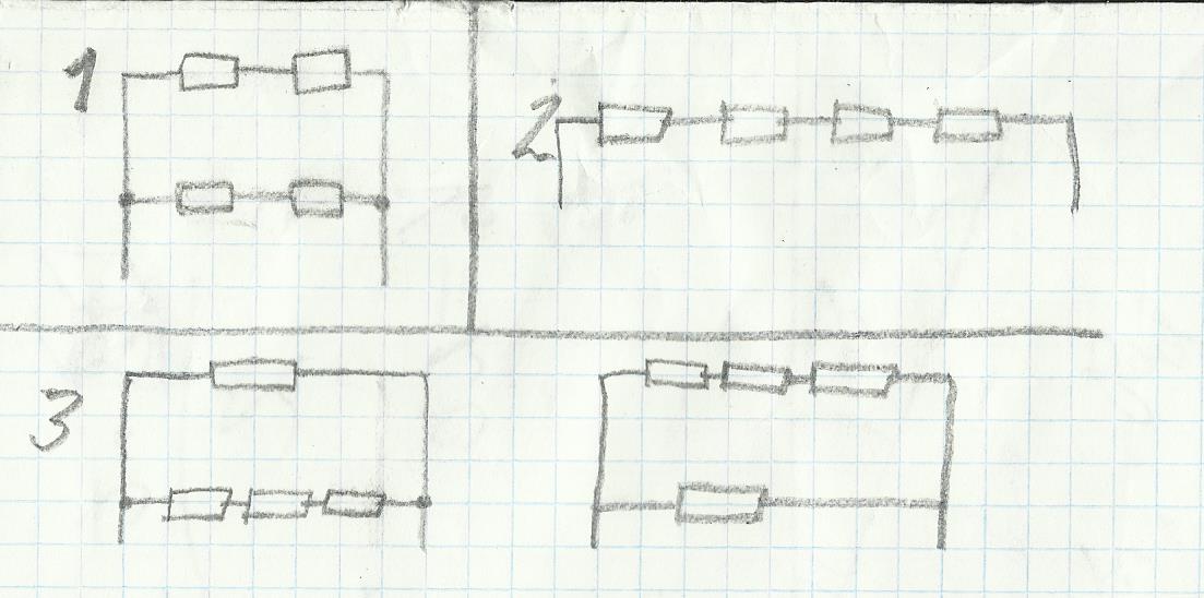 11. Четыре одинаковых сопротивления соединяют различными способами. Начертить все возможные схемы соединений. Определить эквивалентные сопротивления во всех случаях.