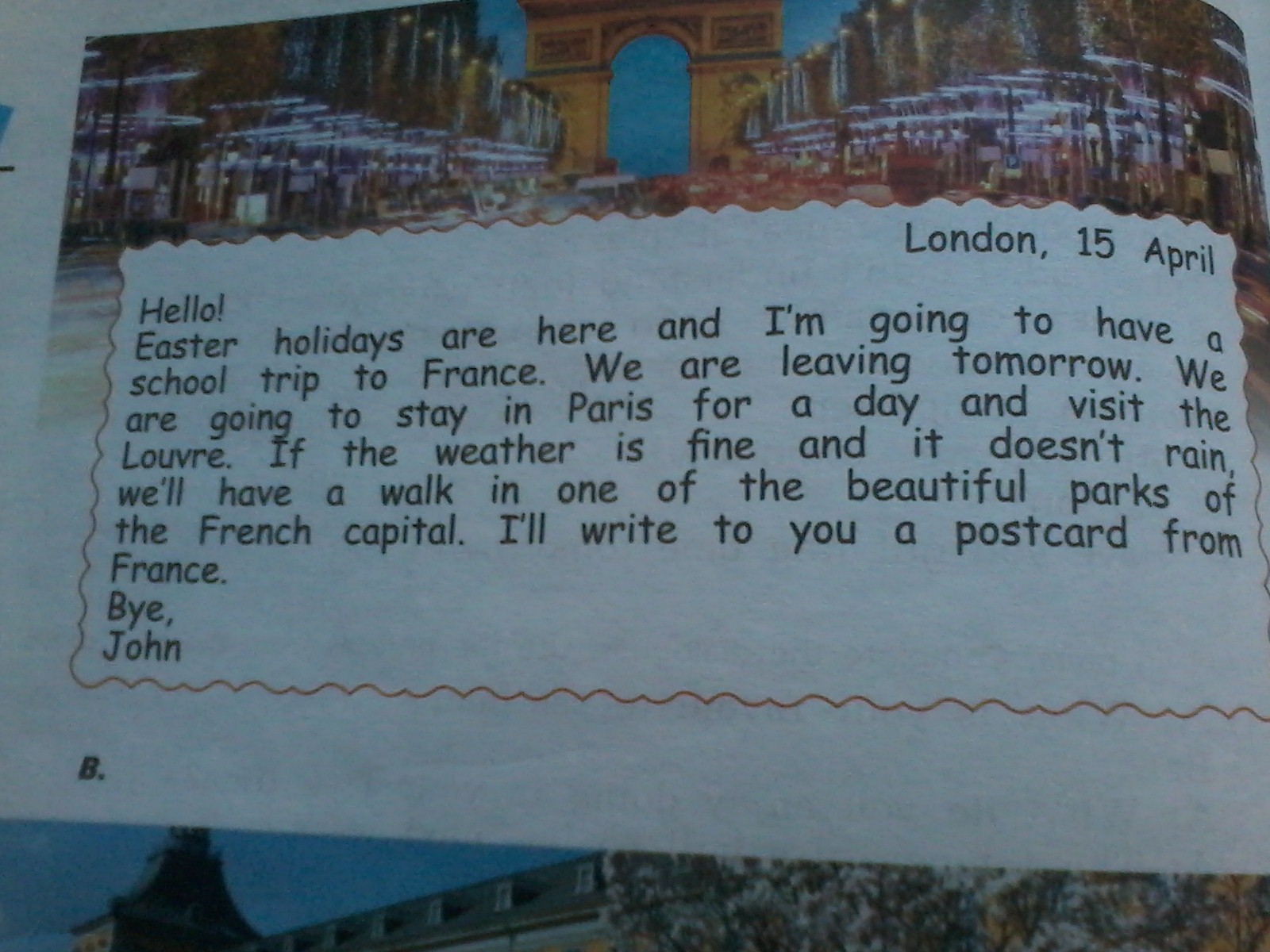 Easter holydays are here and I'm going to London. There I think, I will go to the Whisper Gallery. I defenetly know, that I am going to visit the Houses of Parlament and The Natural History Museum. Do you know that it has a whole size of a blue whale. Do you want something for present? If I have time, I'll buy you a post card with a foto of Buckingam Palace! I must go now. I promise, that I'll write you when I come there.