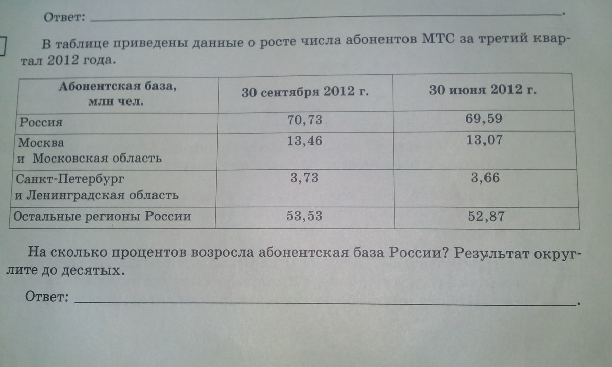 в таблице приведены данные о росте числа абонентов мтс за третий квартал 2012 года.на сколько процентов возросла абонентская база регионов россии отличных от москвы,моск.области,с-петербурга,ленингр.обл.РЕЗУЛЬТАТ ОКРУГЛИТЕ ДО ДЕСЯТЫХ