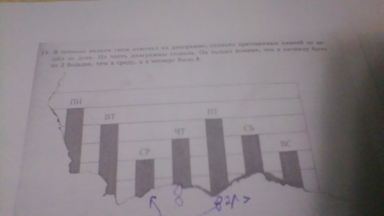 в течение недели гном отмечал на диаграмме сколько драгоценных камней он нашёл за день но часть диаграммы сгорела он только помнит что в пятницу было на 2 больше чем в среду а в четверг было 8 1)сколько всего драгоценных камней нашёл с понедельника по четверг? 2)сколько гном камней нашёл всего?СРОЧНО!!!!!