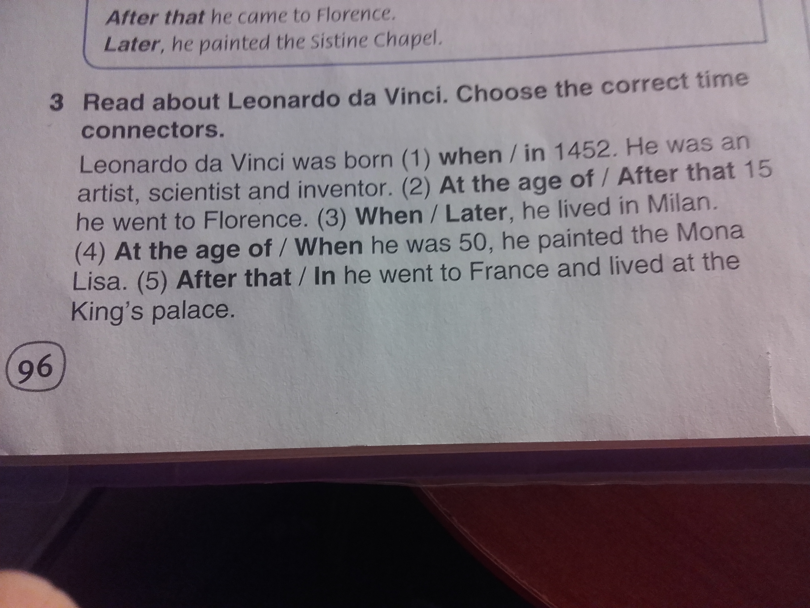 читал про Леонардо да Винчи. Выбрать правильные Разъемы время. Леонардо да Винчи родился (1) Когда я в 1452 году он был художником, ученым и изобретателем. (2) в возрасте после 15 лет он отправился во Флоренцию. (3) при / позже он жил в Милане (4) в возрасте, когда ему было 50, он написал Мону Лизу. (5) После этого / он уехал во Францию и жил в Царском дворце.