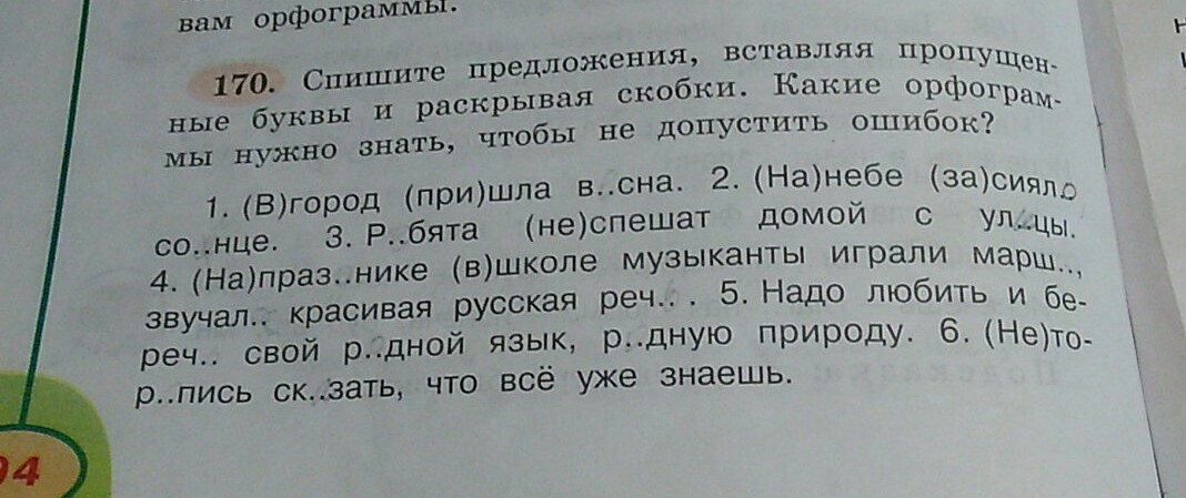 В город пришла весна. На небе засияло солнце. Ребята не спешат домой с улицы. На празднике в школе музыканты играли марш, звучала красивая русская речь. Надо любить и беречь свой родной язык, родную природу. Не торопись сказать, что всё уже знаешь.