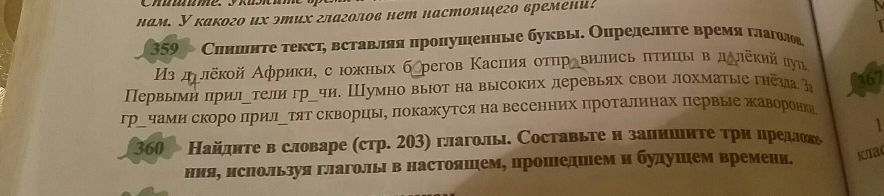 359.Из далёкой Африки,с южных берегов Каспия отправились(прошедшие время)птицы в далёкий путь.Первыми прилетели(настоящее время)грачи.Шумно вьют(настоящее время)на высоких деревьях свои лохматые гнёзда.За грачами скоро прилетят(будущее время)скворцы,покажутся(будущее время) на весенних проталинках первые жаворонки