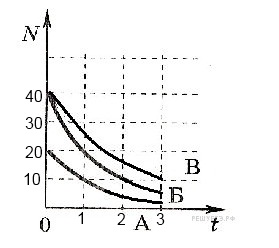 На рисунке приведена зависимость от времени числа не распавшихся ядер в процессе радиоактивного распада для трех изотопов.