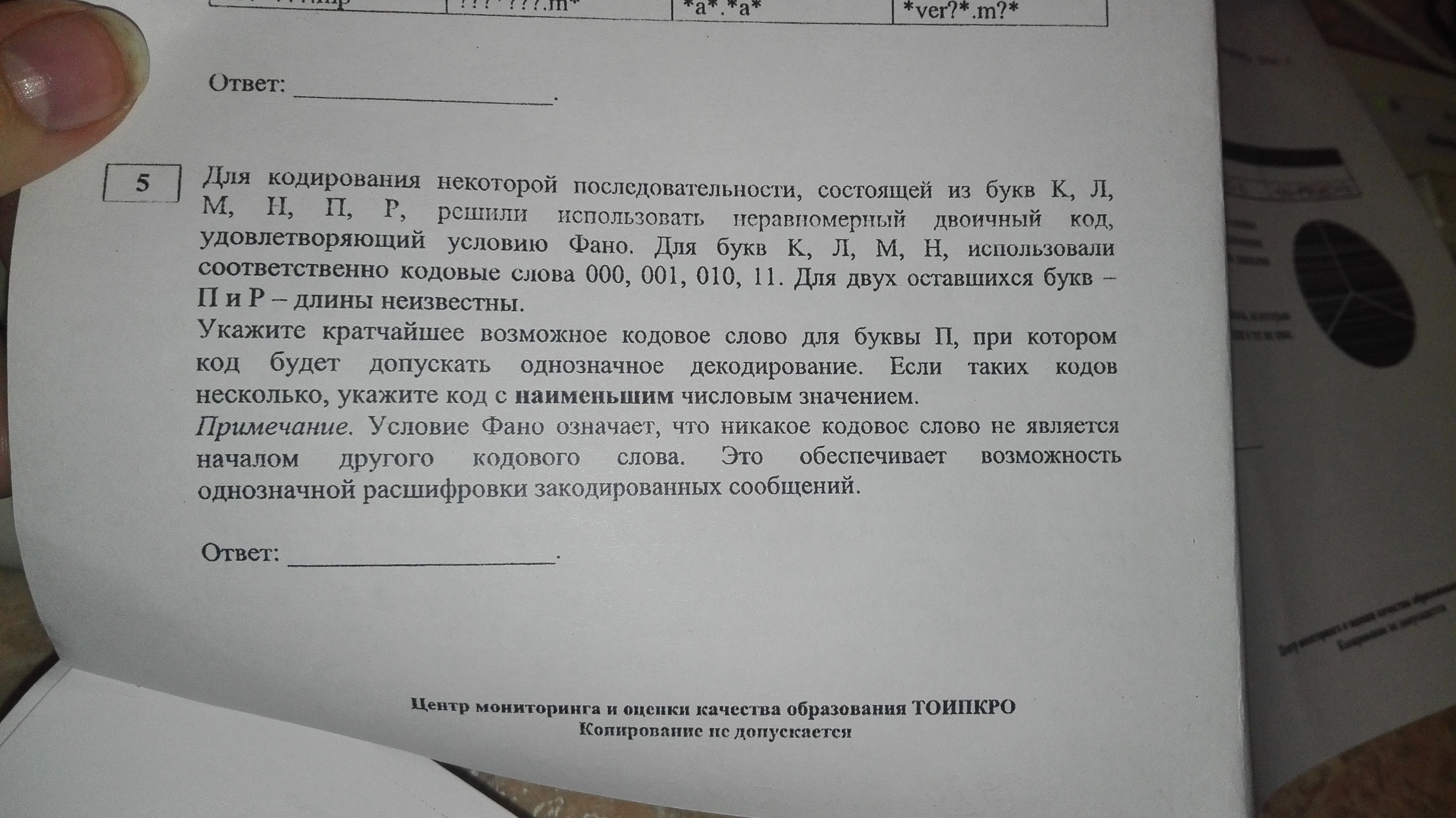 Коды длиной 1 ("1" и "0") использовать нельзя. Рассмотрим кодовые слова длиной 2. 00, 01 и 11 использовать нельзя, т.к. 00 и 01 не удовлетворияю условию Фано, а 11 уже используется. 10 удовлетворяет условию Фано. Ответ 10