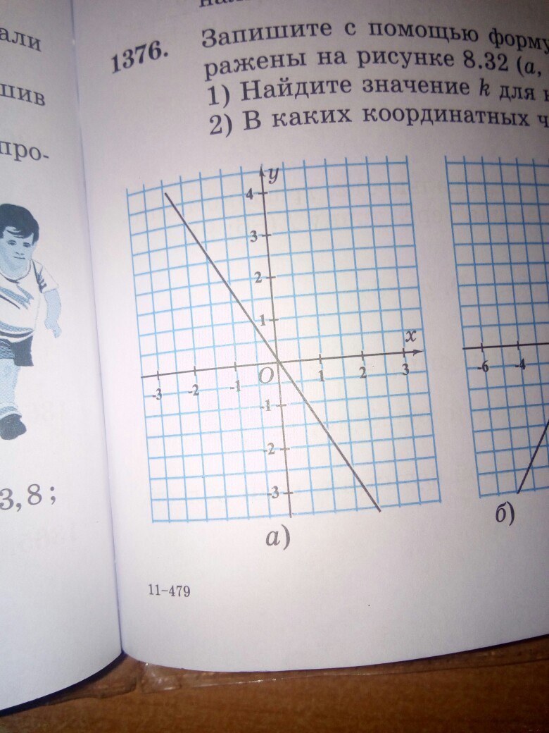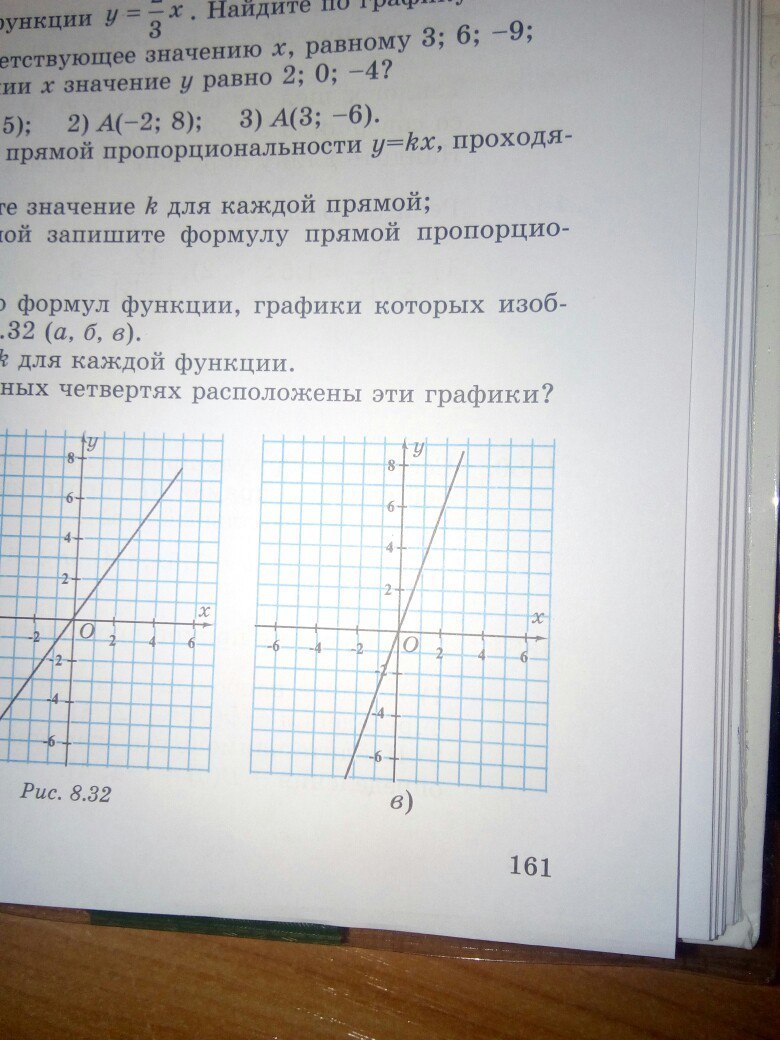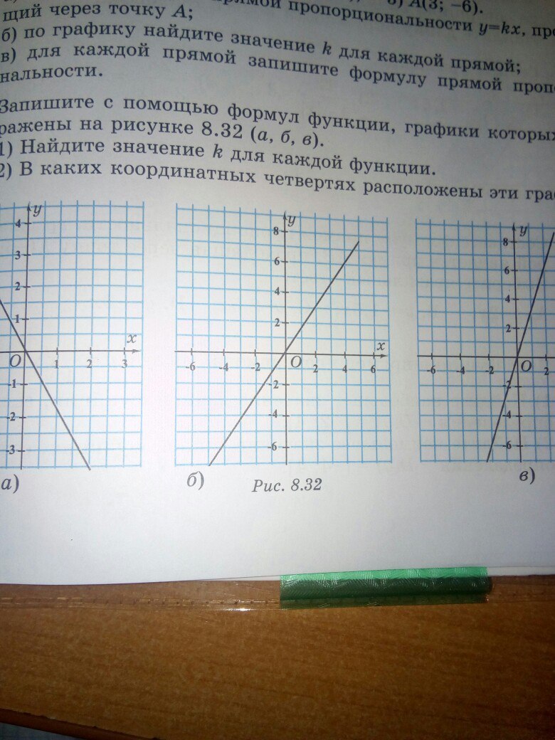 Запишите с помощью формул функции,графики которых изображены на рисунке 8.32 (а,б,в). 1)найдите значение kдля каждой функции. 2)В каких координатных четвертях расположены эти графики?