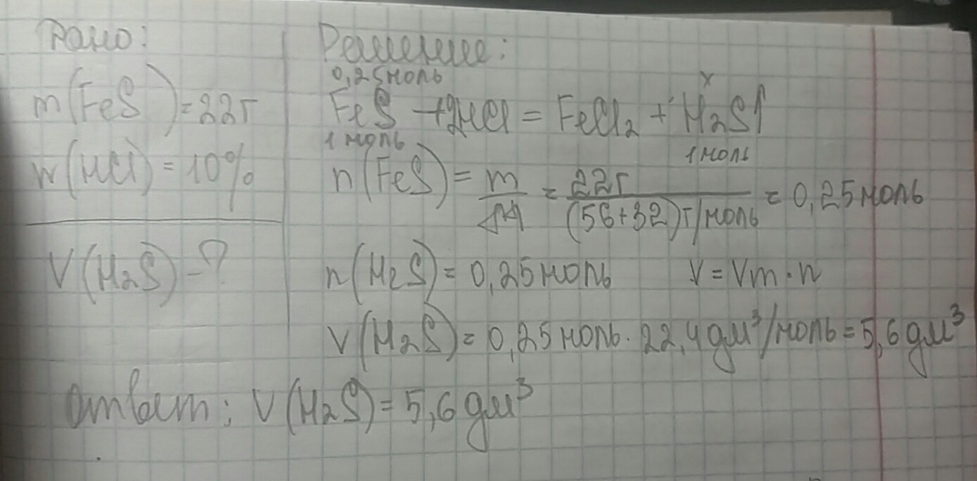Вычислите объем газа (н.у.), который выделится при растворении 22 г сульфида железа (II) в избытке соляной кислоты, массовая доля HCl в которой составляет 10%. Какие данные, содержащиеся в условии задачи, являются, на ваш взгляд, «лишними»? Ответ обоснуйте.