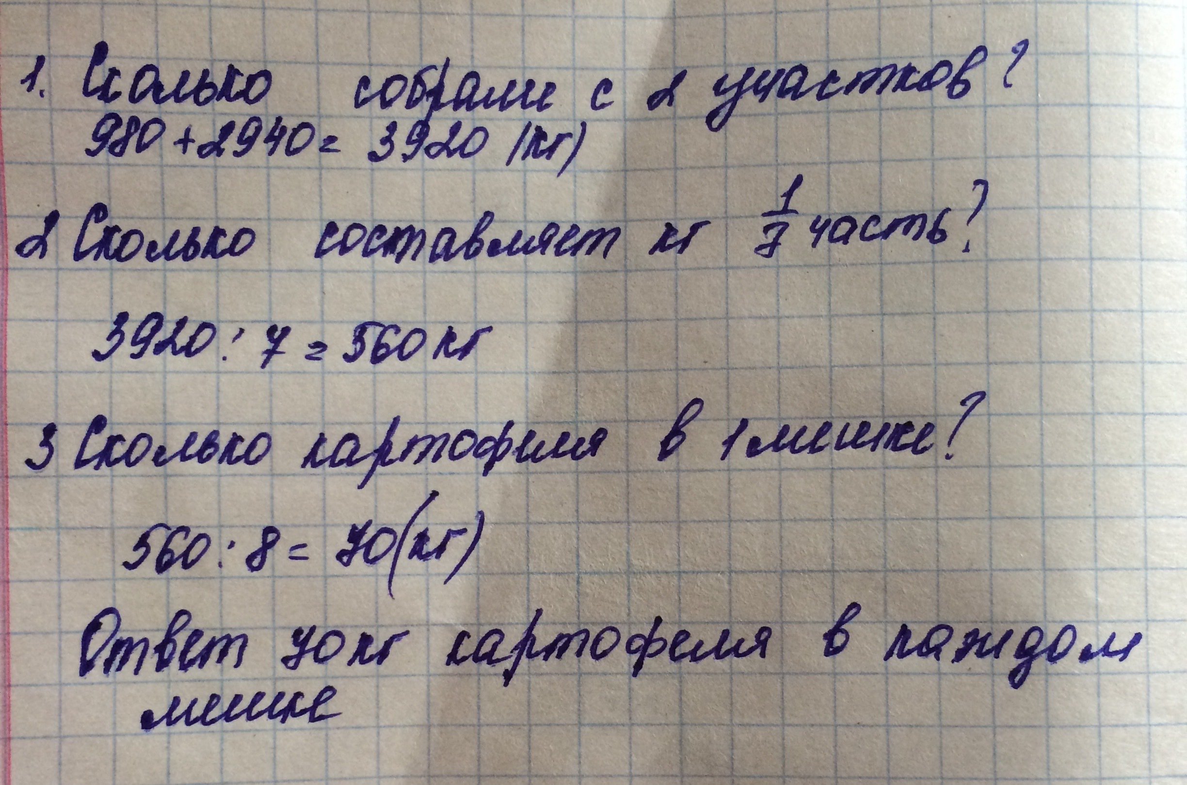 с одного участка собрали 980 кг картофеля а с другого 2940кг 1/7 всего картофеля разложили в8 одинаковых мешков сколько кг картофеля в каждом мешке зарание с пасибо