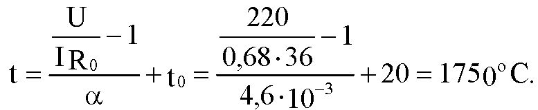 Определите температуру нити накала лампочки, если при включении в сеть напряжением 220 В по нити идет ток 0,68 А. Сопротивление вольфрамовой нити электрической лампочки при температуре 20 °С равно 36 Ом. Тепловой коэффициент сопротивления вольфрама 4,6 • 10-3 К-1
