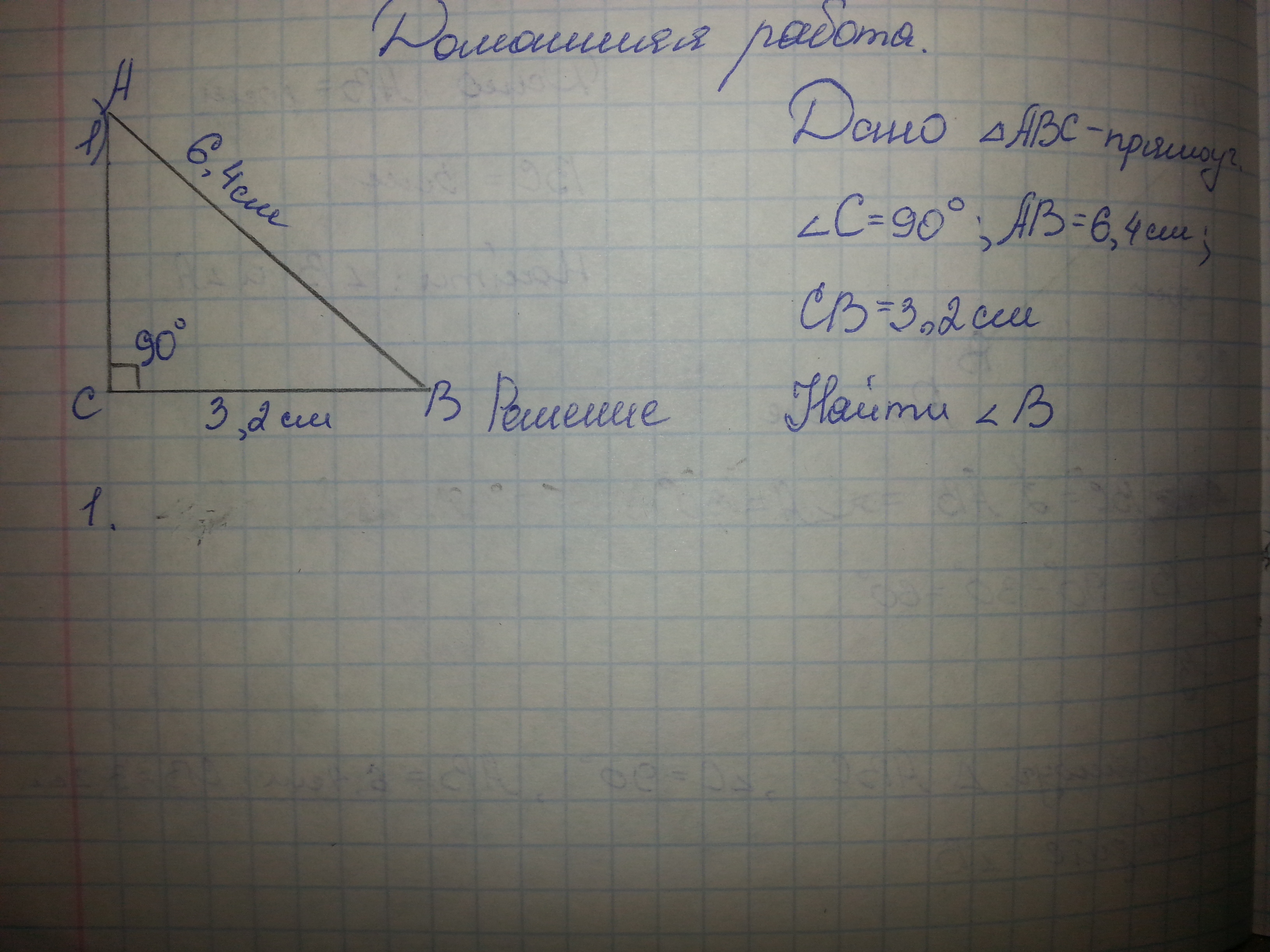 Смотри, катет СВ в два раза меньше гипотенузы АВ ( катет, лежащий против угла 30 градусов равен половина гипотенузы), так вот следовательно угол А равен 30, тогда угол В равен 180-90-30=60