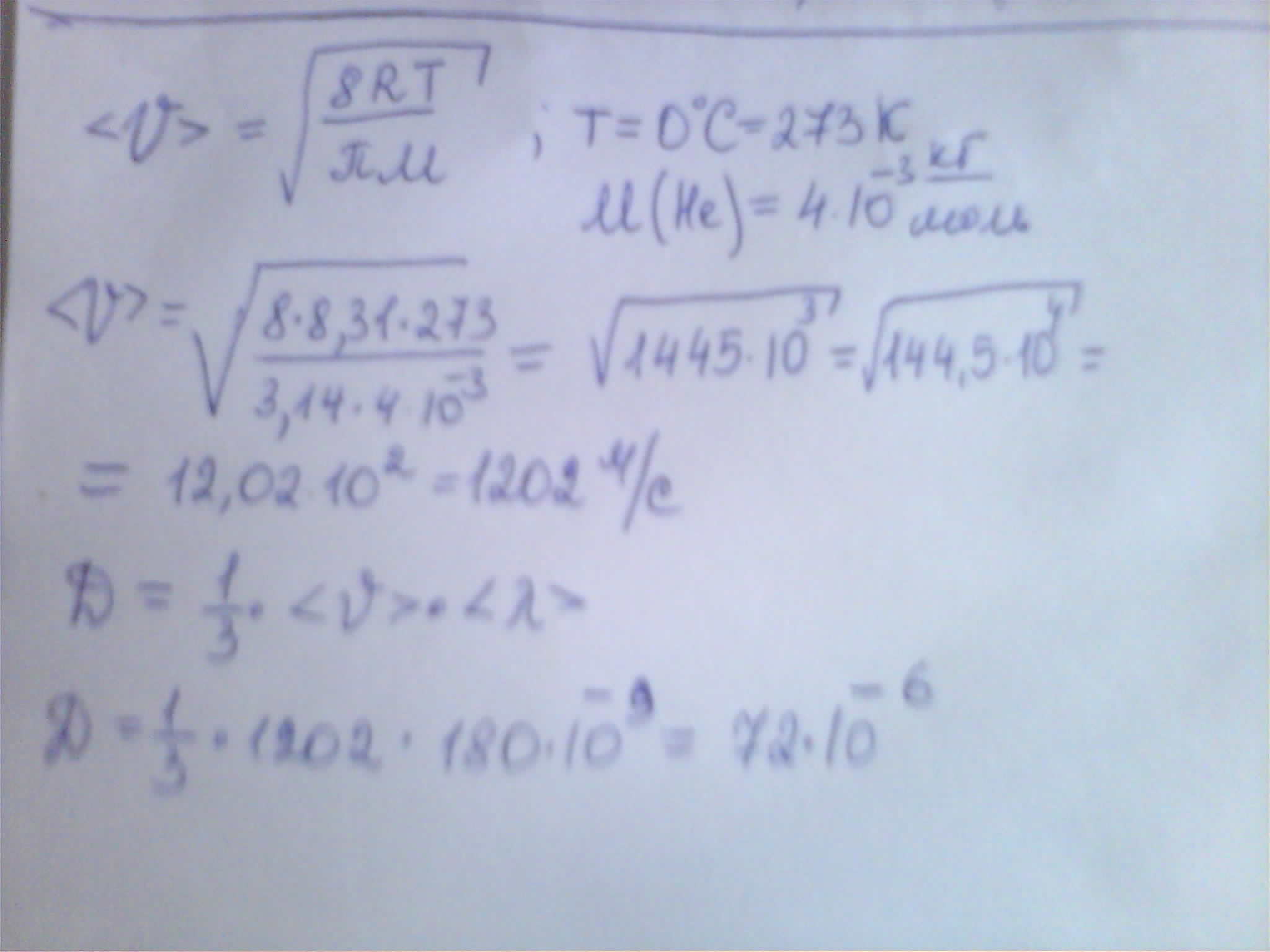 молярная масса гелия M=0.004 кг/моль, D = 180e-9*sqrt(8*8.314*273.15/(pi*4e-3))/3 = 7.21