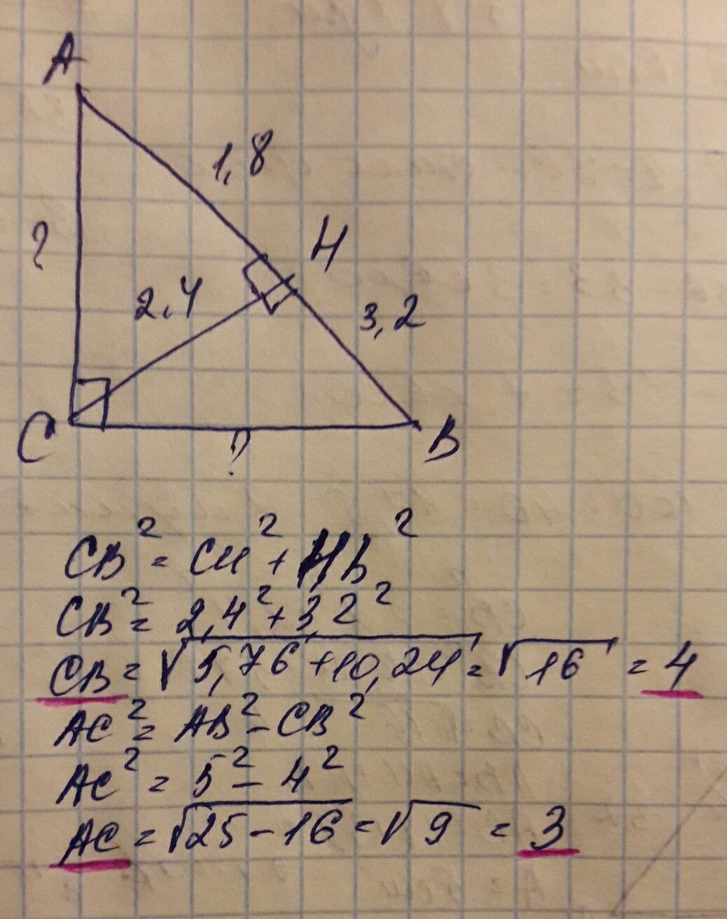 В прямоугольном треугольнике ABC (угол С = 90) проведена высота CH. Найдите длины катетов, треугольника, если CH = 2,4, АH =1,8, а BH = 3,2.