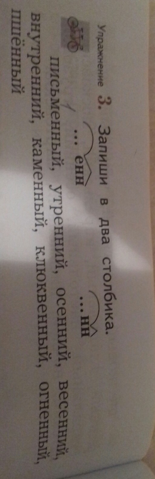 запиши в два столбика письменный утренний осенне-весеннее внутренней каменной клюквенный огненный пшённой