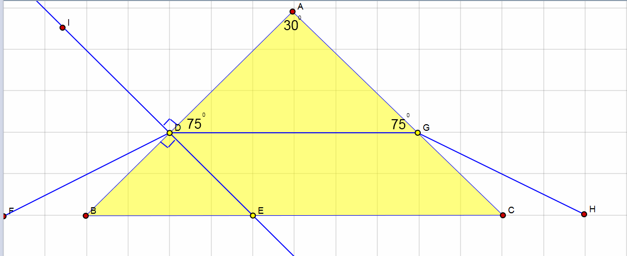 По рисунку видно что тр-к ADG-равносторонний(ВС||DG);угол А=30гр.,тогда угол ADG=(180-30)/2=75гр.