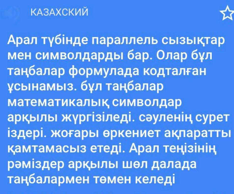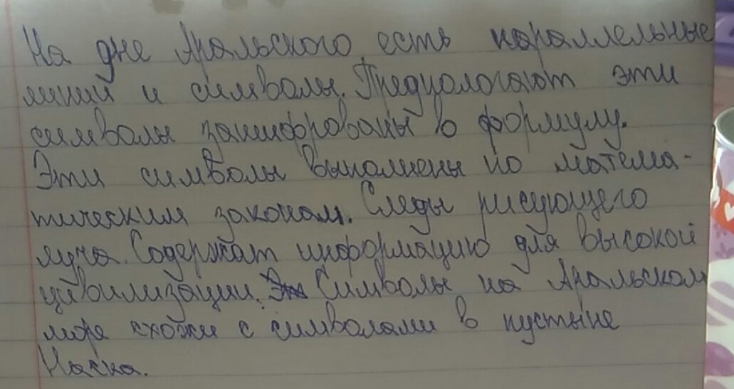Арал тyбінде параллель сызықтар мен символдар бар. Fалымдардын пайымдауынша б¥л танбалар формулада кодталады. Б¥л танбалар математикалық зандармен жyзеге асырылады. Жоғары өркениеттер ақпаратты қамтамасыз етеді. Арал тенізіндегi символдар Наска шөлді аймаFындагы танбаларға ¥қсас
