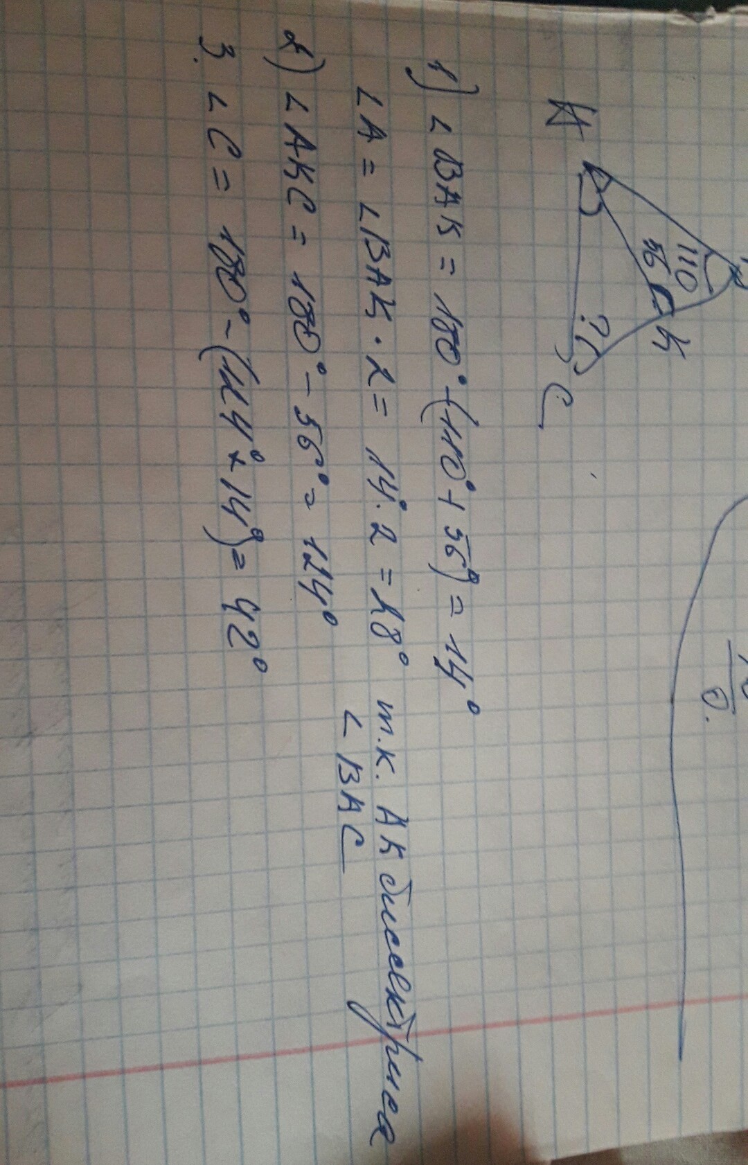 В треугольнике АВС проведена биссектриса АК.Найдите величину угла АСВ, если угол ABK=110 градусов, а угол ВКА =56 градусов.