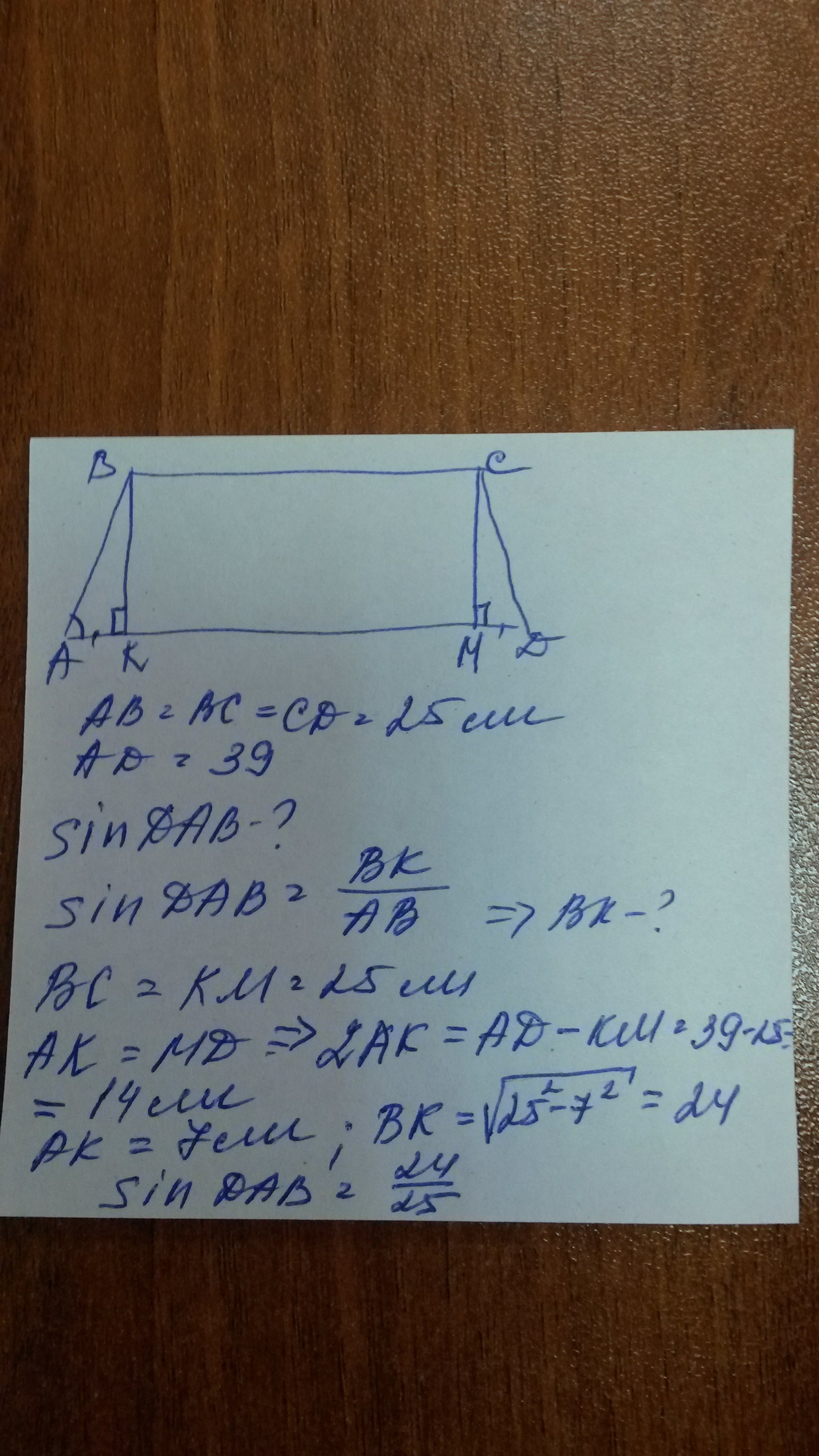 В трапеции ABCD с основаниями BC и AD стороны AB, BC и CD равны 25 см, а сторона AD равна 39 см. Найдите синус угла DAB