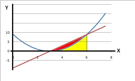 Линии, пересекаясь, образуют фигуру закрашенную на рисунке красным цветом. Чтоб найти ее площадь нужно из площади треугольника под прямой вычесть площадь под параболой, закрашенную желтым.