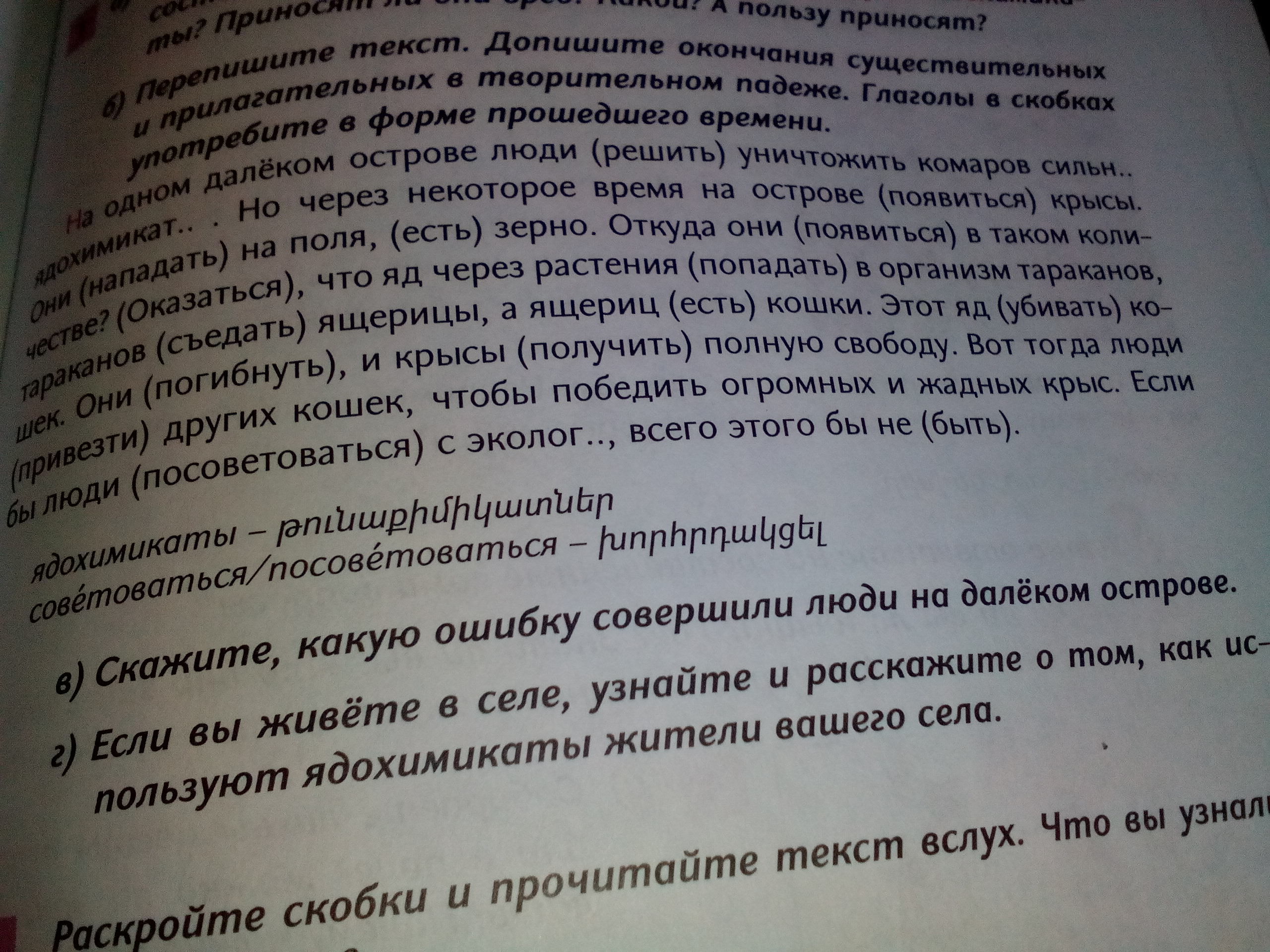на одном далёком острове люди решили уничтожить комаров сильным ядохимикатом.но через некоторое время на острове появились крысы. они нападали на поля,ели зерно.Откуда они появились в таком количестве?Оказалось,что яд через растения попадал в организм тараканов,тараканов съедали ящерицы,а ящериц ели кошки.Этот яд убивал кошек.Они погибли,и крысы получили полную свободу.Вот тогда люди привезли других кошек,чтобы победить огромных и жадных крыс.если бы люди посоветовались с экологом,всего этого бы не было.