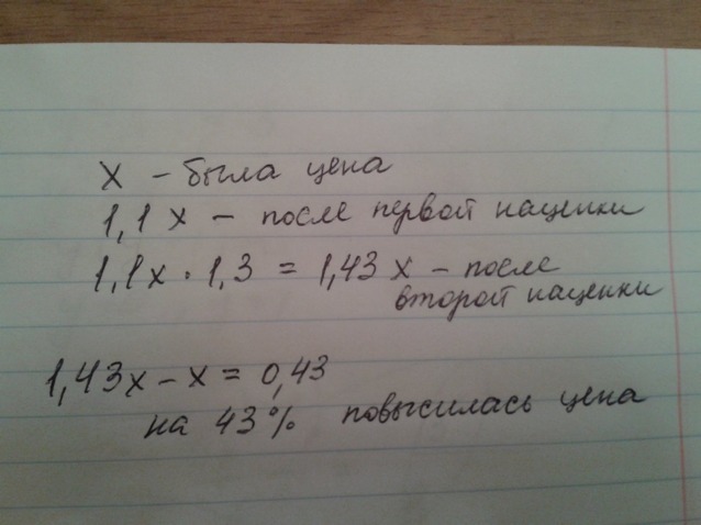 В течении месяца цена на товар повысилась на 10℅,а затем еще на 30℅.На сколько процентов всего повысилась первоначальная цена товара?