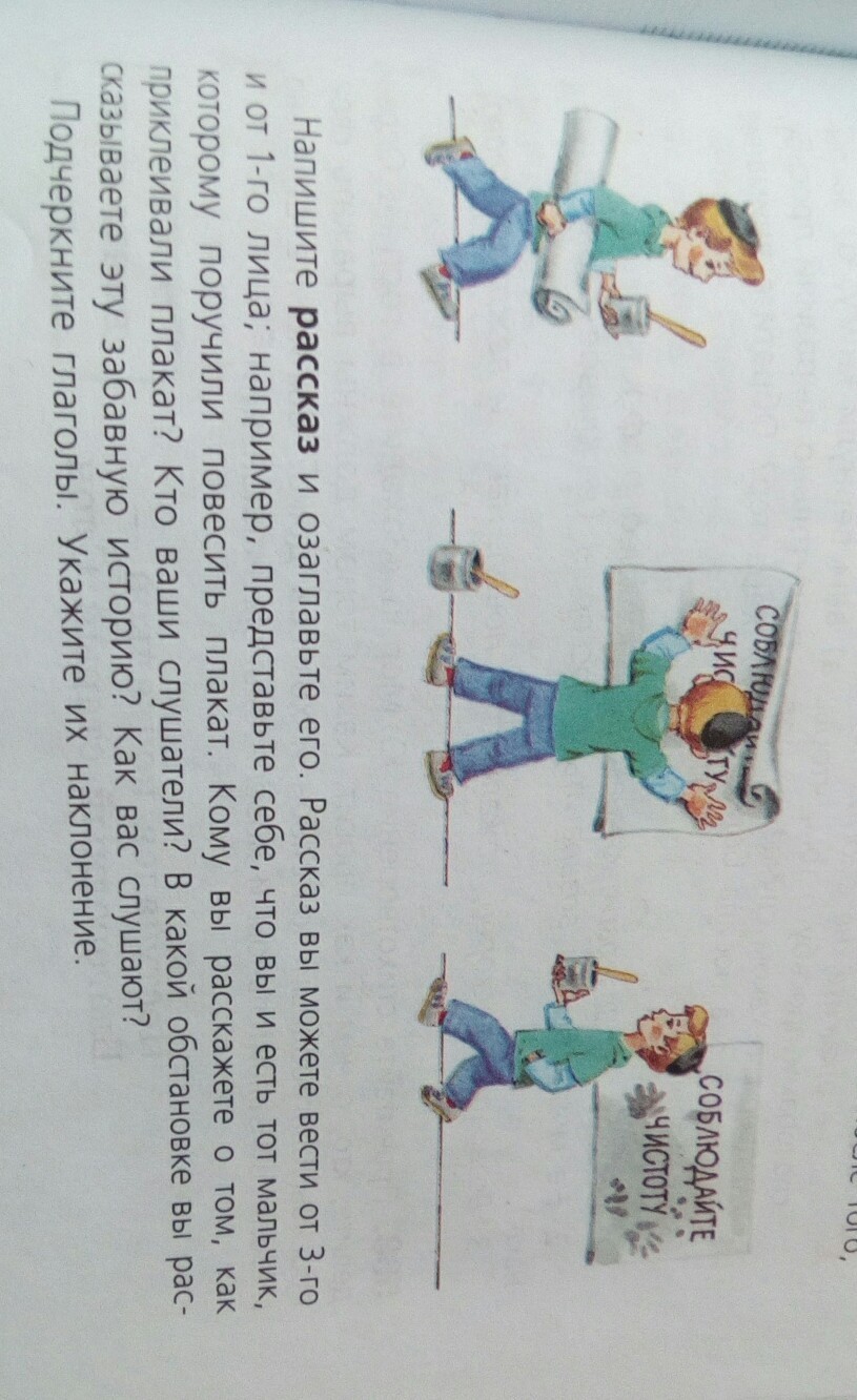 Петя учился в четвёртом классе.Каждый день они разговаривали о чистоте,как её соблюдать.Наконец-то они обсудили это дело.Петя взял ответственность на себя.Взял бумагу и начал писать;"Соблюдайте чистоту!".На следующий день он повесил этот плакат на стену коридора,затем ушёл.Плакат был в следах от рук Пети.В итоге сам он не соблюдал чистоту.
