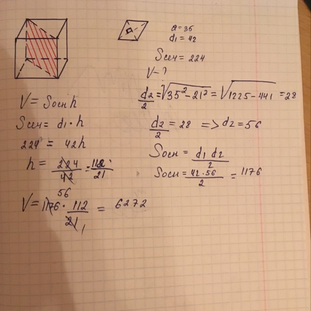 Основание прямого параллелепипеда служит ромб со стороной 35см и меньшей диагональю 42 см, площадь диагонального сечения, проведённого через эту диагональ 224, вычислить обьём и полную поверхность.