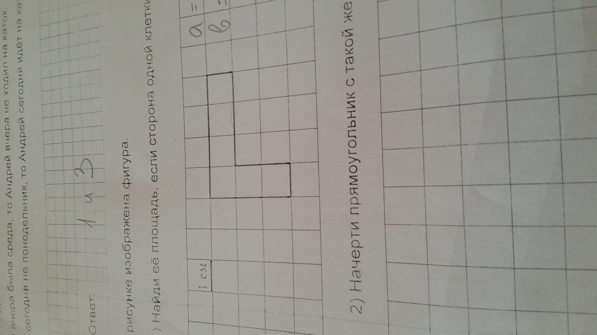 на рис.изображена фигура.найти ее площадь если сторона 1 клетки равна 1см.И начертить прямоугольник с такой же площадью