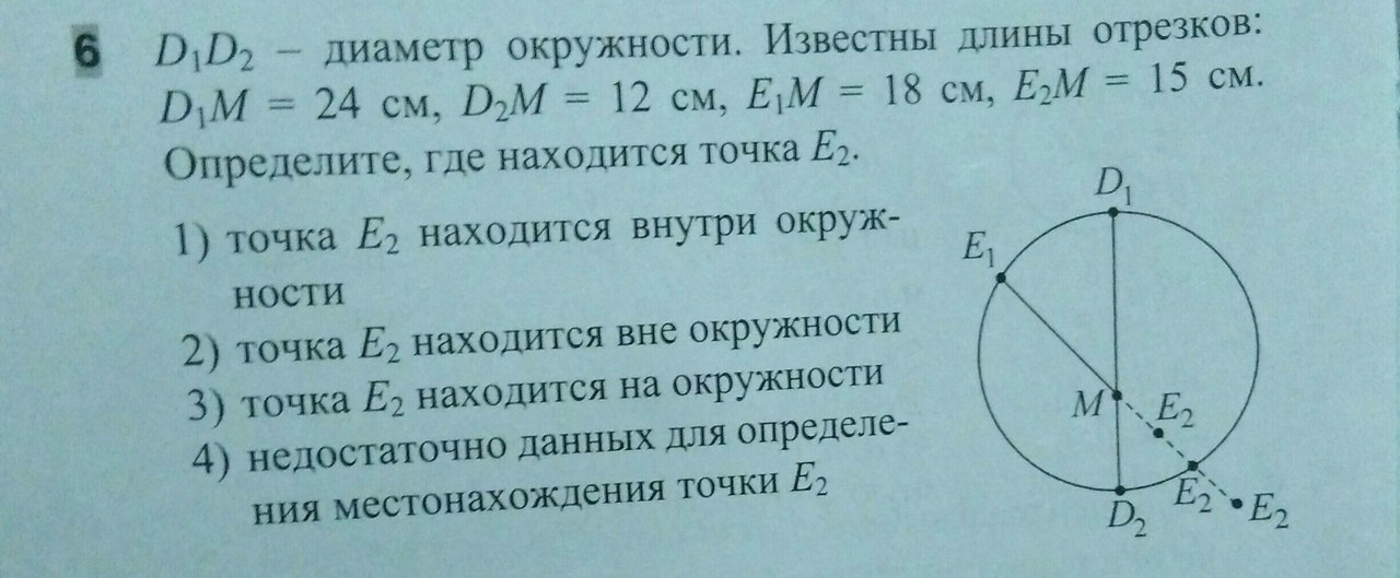 D1D2 - диаметр окружности. Известны длины отрезков: D1M = 24cm; D2M = 12 cm; E1M = 18 cm; E2M = 15 cm. Определите, где находится точка E2.