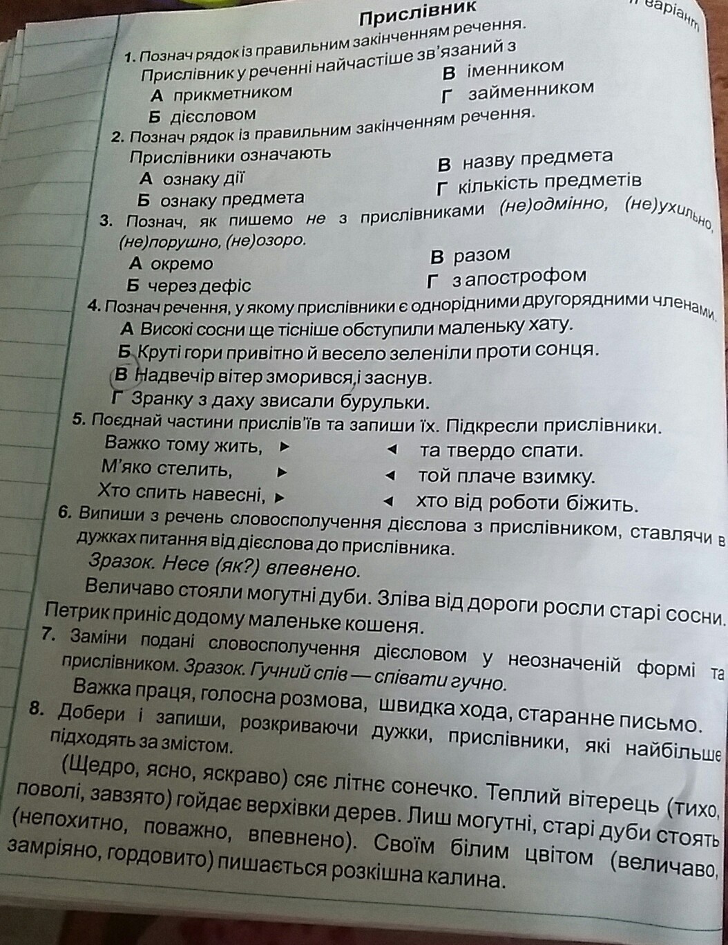 6. Стояли ( як?) величаво, ( де?) зліва від дороги, приніс ( куди?) додому.