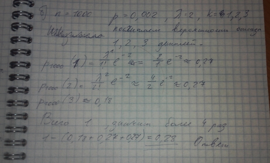 а) По условию дано: .n=1000 p=0.002 лябда(далее L) = n*p=2 k=3
