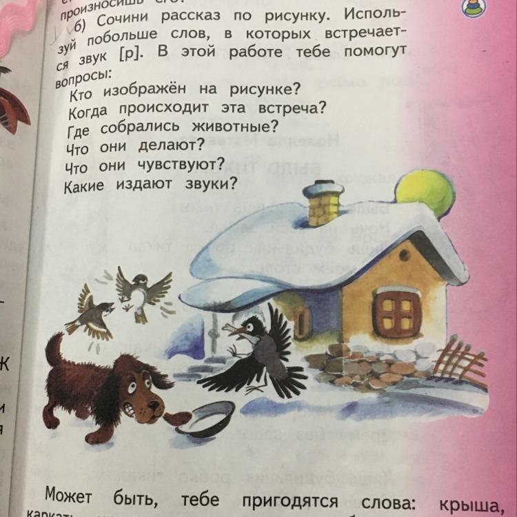 Сочини рассказ по рисунку. Можно использовать слова: крыша, каркать, крыльцо,крик, драка, собраться, замёрз, грязный, украсть, барбос, рычать, вырвать!