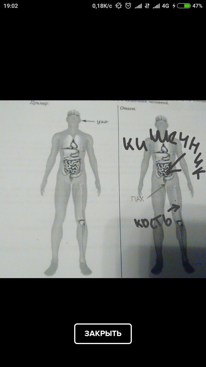 Рассмотри изображение человека. Так же, как и на примере слева отмечено ухо, на изображении справа Покажи стрелками и Подпиши пах, кость скелета и кишечник человека