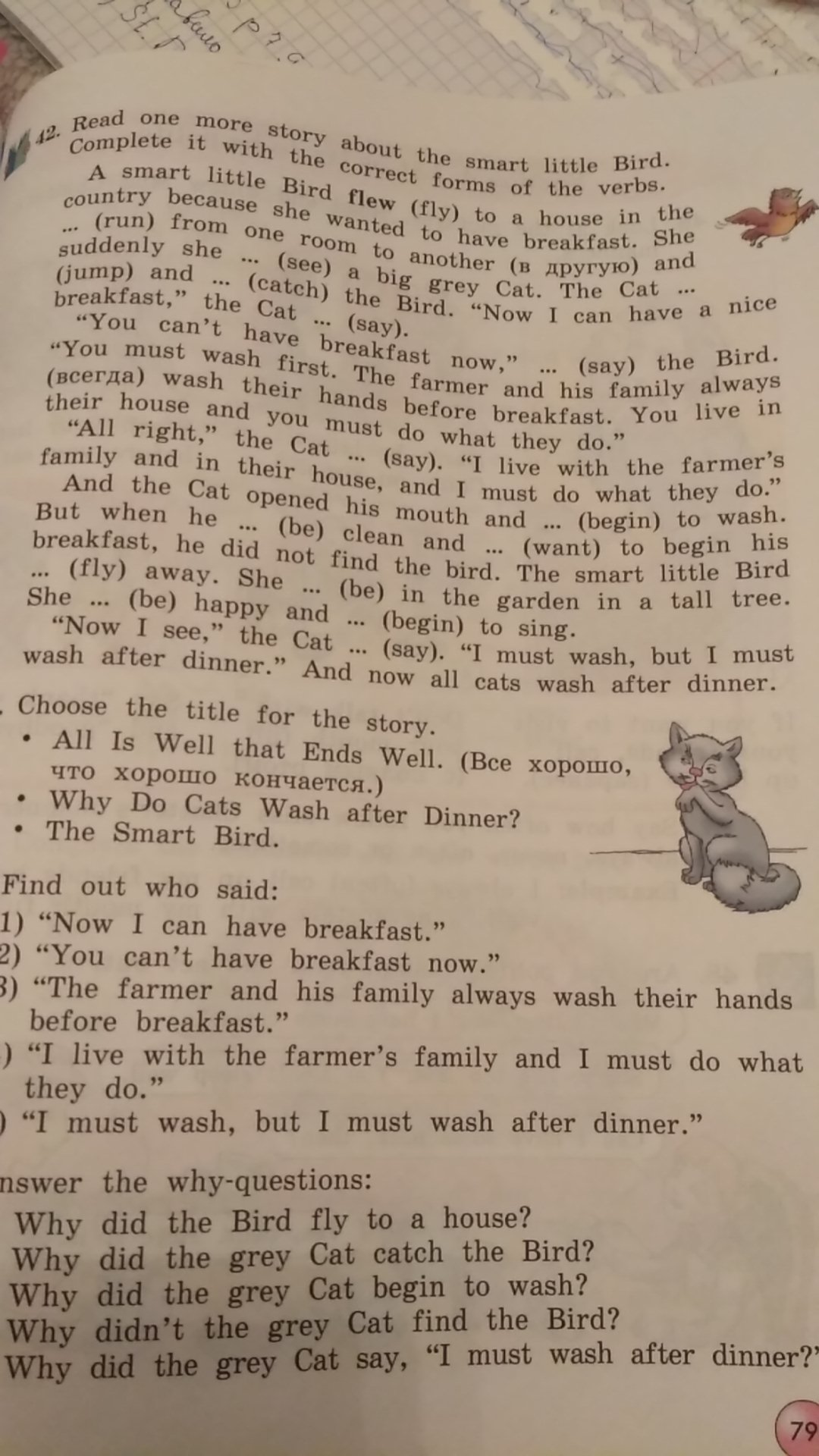 Затем кот открыл свой рот и начал умываться. Но когда он был чист и хотел продолжить свой завтрак,он не нашёл птичку. Маленькая умная птичка улетела. Она была на высоком дереве в саду. Она была весела и начала петь.