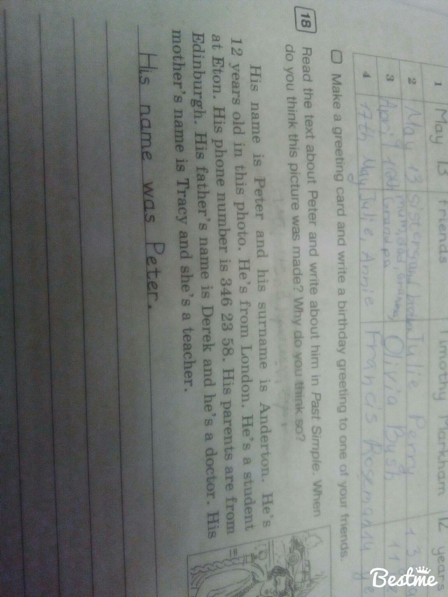 His name was Peter and his surname was Anderson. He was 12 years old in that photo. He was from London. He was a student at Eton. His phone number was 346 23 58. His parents were from Edinburgh. His father's name was Derek and he was a doctor. His mother's name was Tracy and she was a teacher.