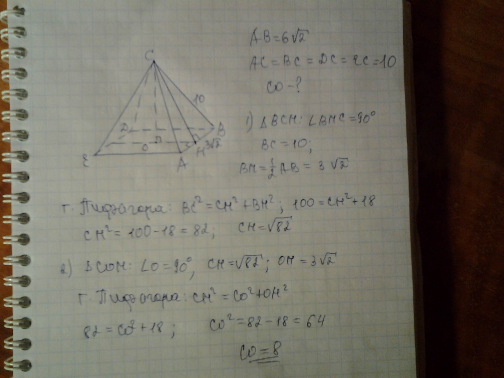 Сторона кяадрата 6корінь2.точка М віддалена від кожноївершини на 10 см. Знайти відстань від точки м до площини квадрата