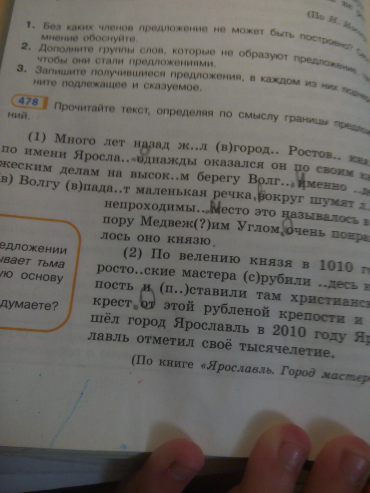По велению князя в 1010 году ростовские мастера (подл) срубили (сказ) здесь крепость и поставили (сказ) там христианский крест. От этой рубленой крепости и пошел (сказ) город Ярославль (подл). В 2010 году Ярославль (подл) отметил (сказ) свое тысячелетие.
