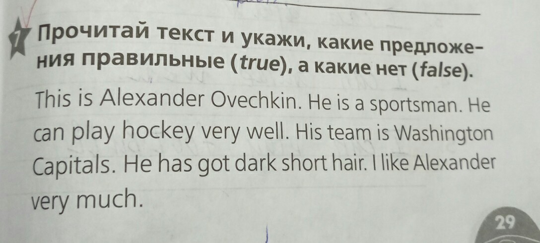 упражнение с дополнением.... 1) Alexander's surname is Ovechkin.____ 2) He has got fair.____ 3) He cant play hockey.___ 4) He is a good hockey player.___ 5) he plays in a Russian team.___