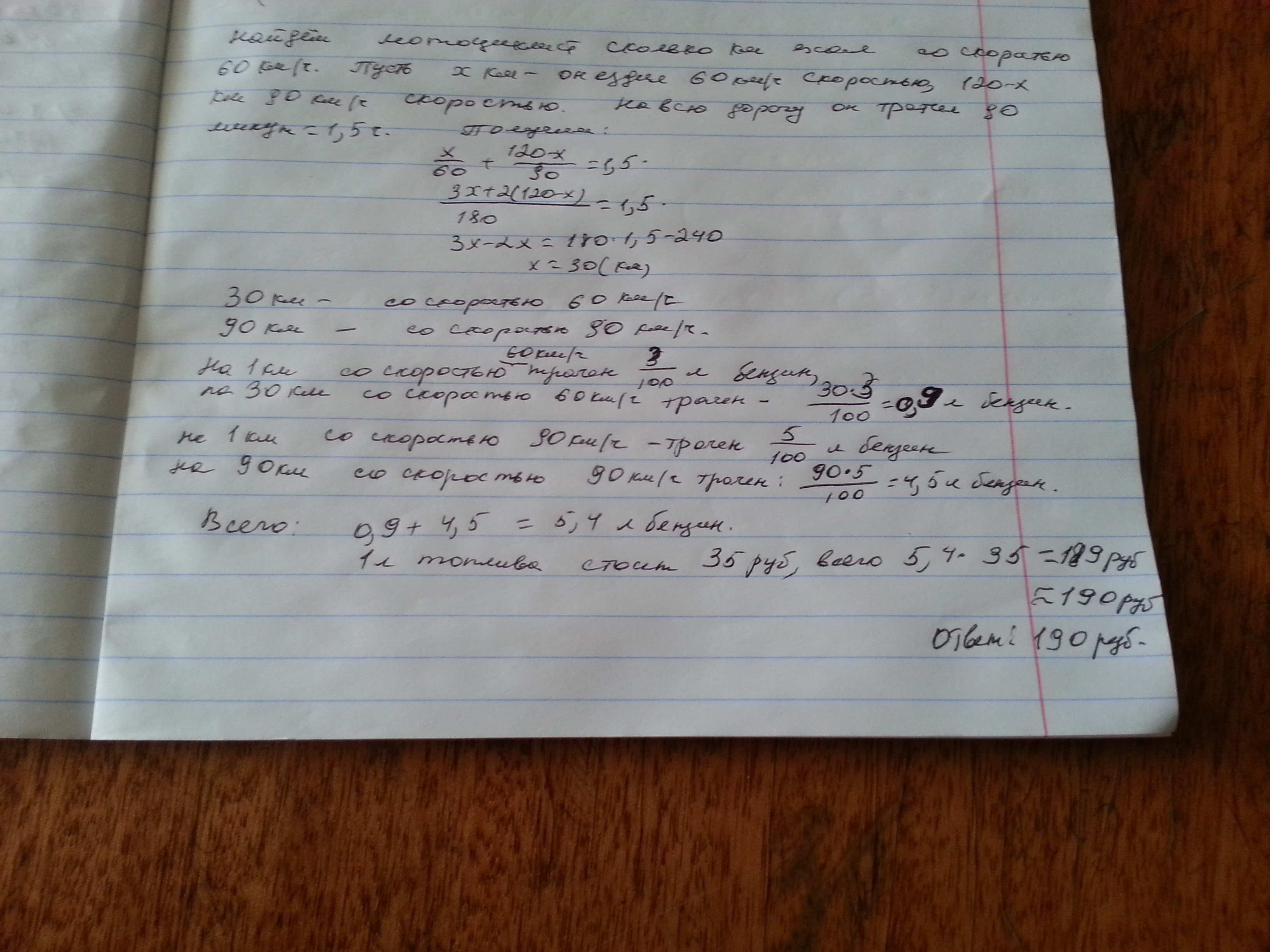Мотоциклист проехал путь из города в деревню за 80 минут80 минут, при этом первую часть пути он ехал со скоростью 60 км/ч60 км/ч, а оставшийся путь – со скоростью 90 км/ч90 км/ч. Известно, что при движении со скоростью 60 км/ч60 км/ч расход топлива составляет 3 литра3 литра на 100 км100 км пути, а при движении со скоростью 90 км/ч90 км/ч – 5 л5 л на 100 км100 км. Определите стоимость потраченного им топлива, если путь из города до деревни равен 110 км110 км, а цена 1 л1 л топлива составляет 30 рублей30 рублей. Ответ выразите в рублях, округлив до целых.